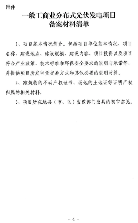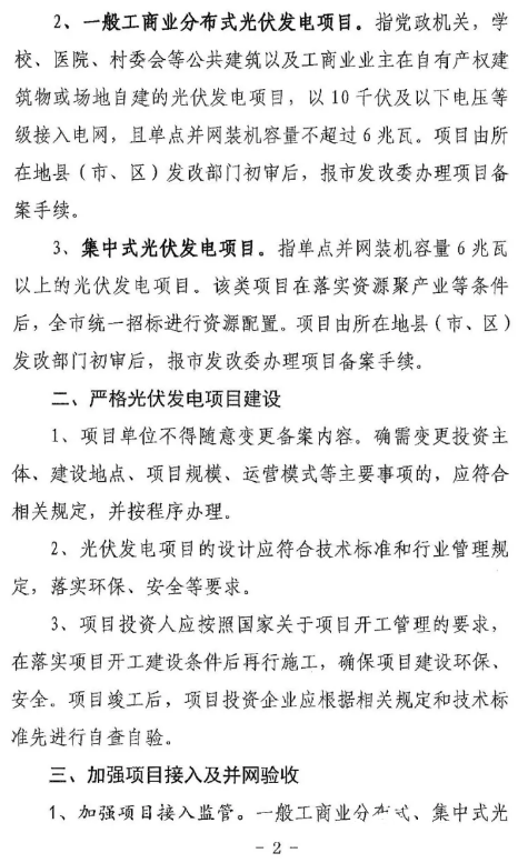 一般工商業分布式光伏發電項目:指黨政機關,學校、醫院、村委會等公共建筑以及工商業業主在自有產權建筑物或場地自建的光伏發電項目,以10千伏及以下電壓等級接入電網,且單點并網裝機容量不超過6兆瓦。項目由所在地縣(市、區)發改部門初審后,報市發改委辦理項目備案手續。