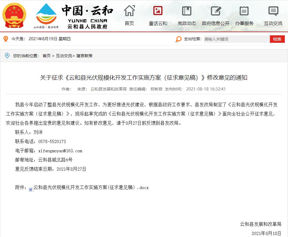 8月18日,云和縣發展和改革局發布關于征求《云和縣光伏規模化開發工作實施方案(征求意見稿)》修改意見的通知。