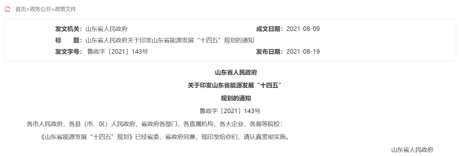 【政策通知】山東省人民政府印發(fā)能源發(fā)展“十四五”規(guī)劃
